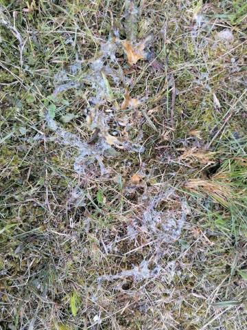 Gliemežu izvirdums zālē, kur apakšā ir būvgruži. Nākamajā naktī pēc sāls uzbēršanas caurumiem. Meita paspēja nolasīt bēgļus, daži palieli īpatņi uz zāles stiebriem esot glābušies.