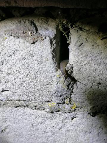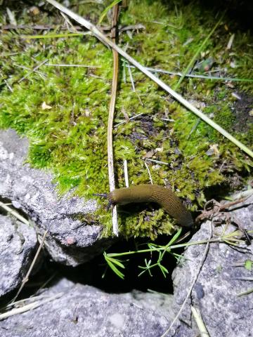 Melngalvas mīkstgliemezis dodas iknakts gaitās.
