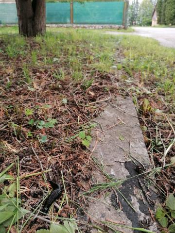 Gliemežu izvirdums zālē, kur apakšā ir būvgruži. Nākamajā naktī pēc sāls uzbēršanas caurumiem. Meita paspēja nolasīt bēgļus, daži palieli īpatņi uz zāles stiebriem esot glābušies.